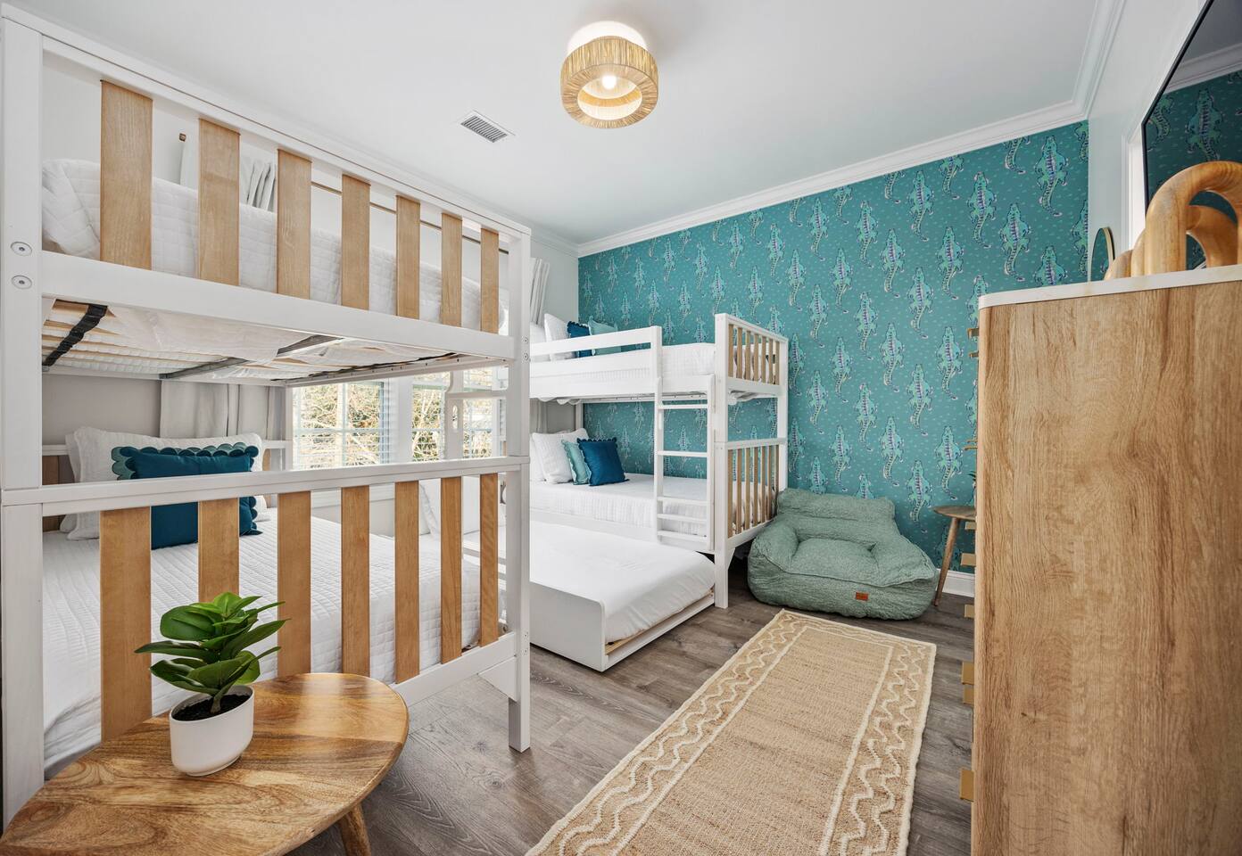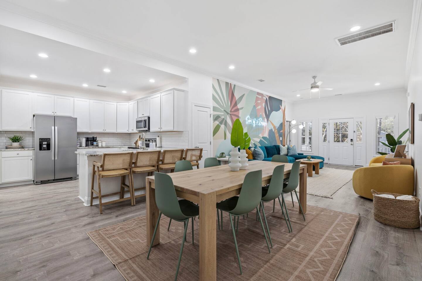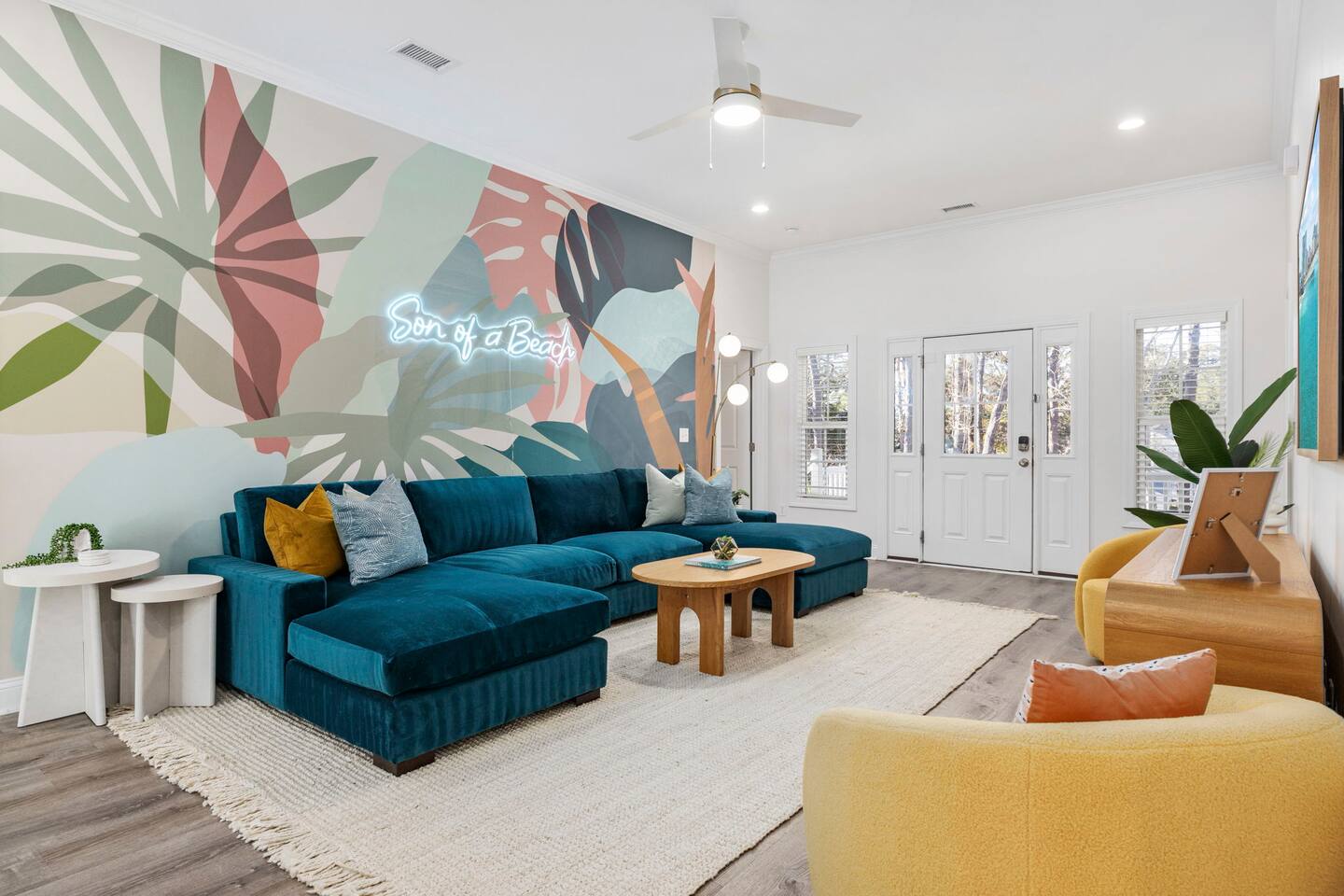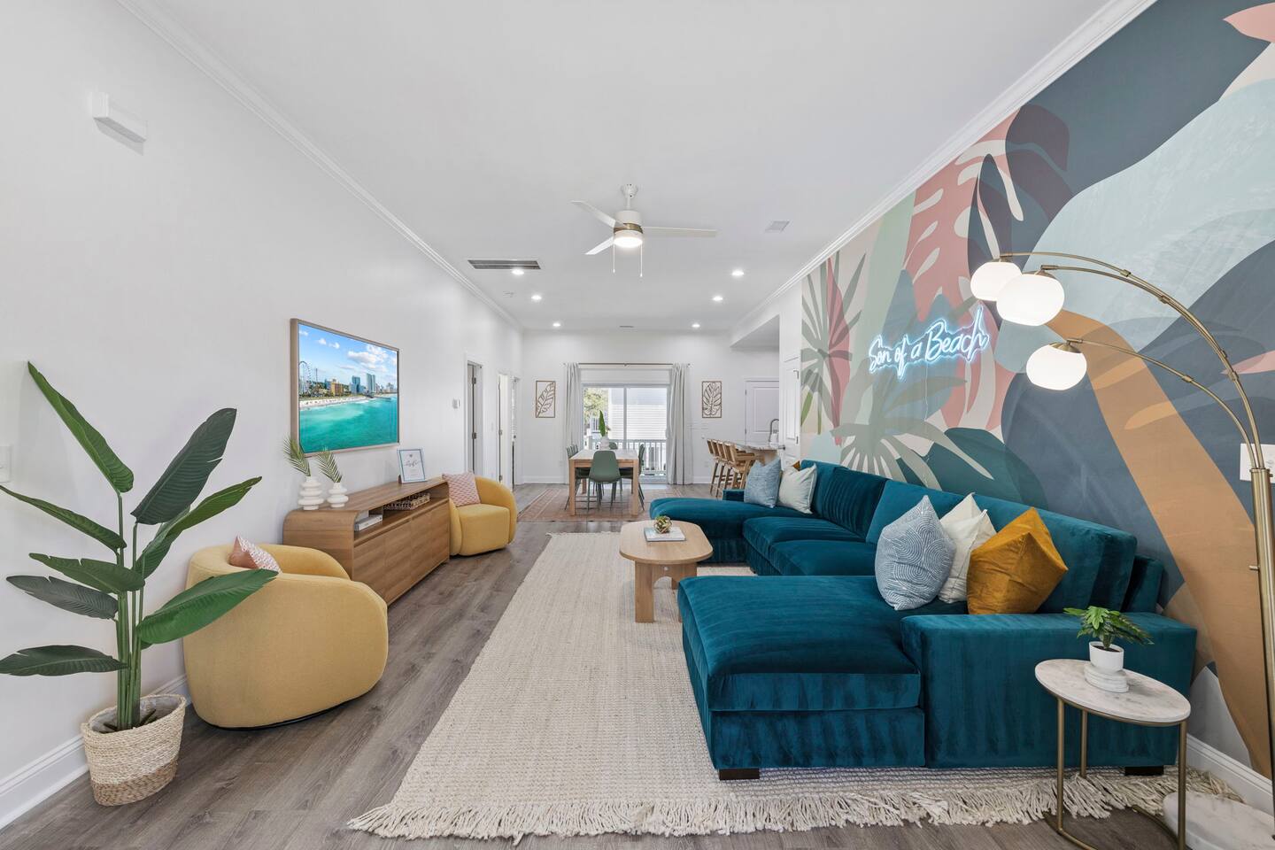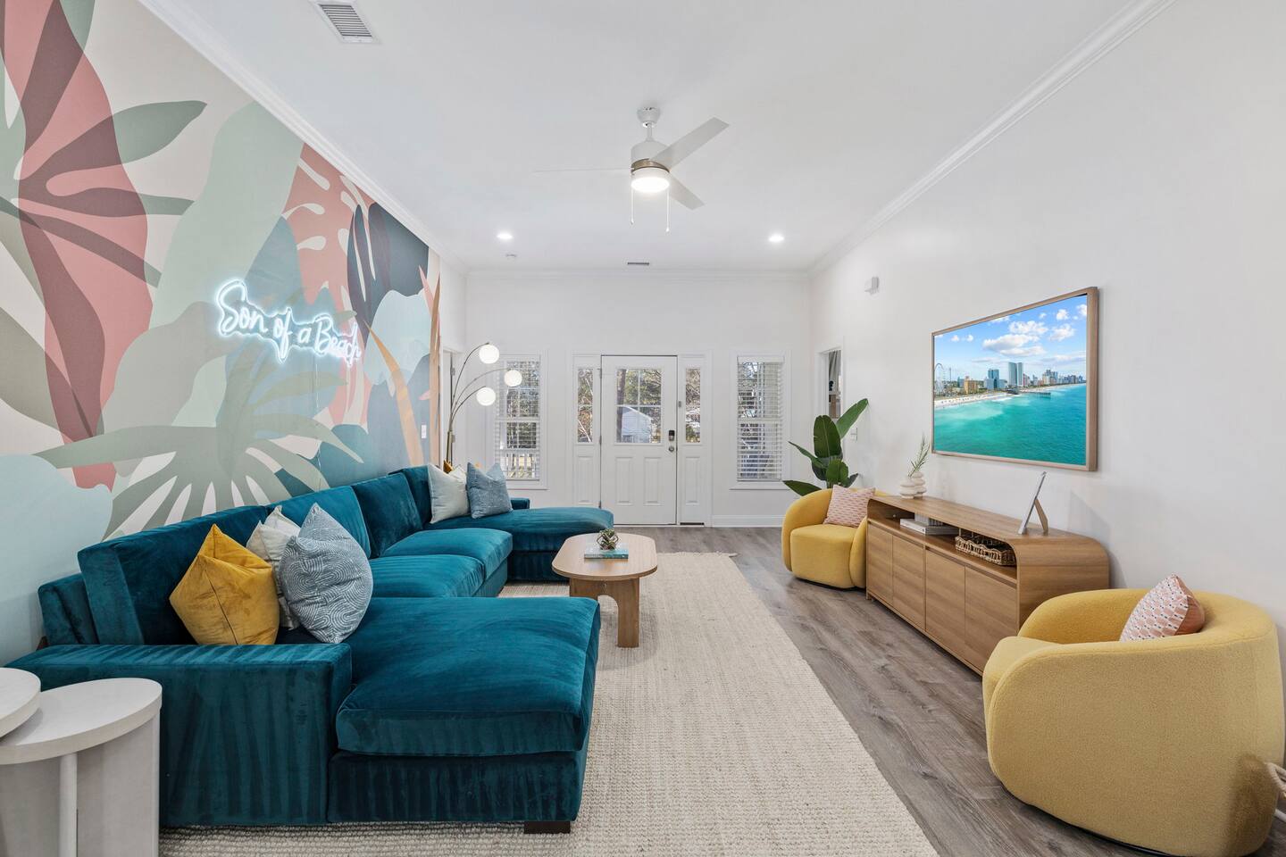 Inside, the home welcomes you with a bright and inviting living room, featuring a plush teal sectional sofa accented with colorful throw pillows and a playful mural that sets the tone for your stay. The open dining area includes a modern wooden dining table with seating for eight, complemented by chic leaf-inspired wall art. The fully equipped kitchen offers everything you need to prepare meals, whether you're whipping up breakfast before heading to the beach or enjoying a relaxed dinner at home. Each bedroom has been thoughtfully designed with its own personality: the master suite showcases soothing palm tree wallpaper and a serene color palette, while the second king room pops with rich teal walls and golden accents. The third king bedroom embraces a lush tropical vibe with banana leaf wallpaper and soft, earthy tones, and the bunk room is a whimsical retreat featuring vibrant seahorse-patterned wallpaper and two twin-over-twin bunk beds. Outside, the magic continues. Your private heated saltwater pool is surrounded by ample lounging space, perfect for soaking up the sun or enjoying a refreshing dip. The covered deck features comfortable seating for relaxing with morning coffee or evening cocktails, while the dining area under the house is ideal for al fresco meals. String lights add a cozy ambiance to both spaces, making evenings truly special. Lounge chairs and bright decorative pillows line the patio, creating the perfect spot for unwinding after a day of exploring. For added convenience, rent the on-site golf cart to zip to the beach or explore nearby Barefoot Landing, known for its shopping, dining, and entertainment options. With its unbeatable location, thoughtful amenities, and stylish decor, "Son of a Beach" is more than just a vacation home—it’s a destination. Book your stay today and experience the very best of North Myrtle Beach!