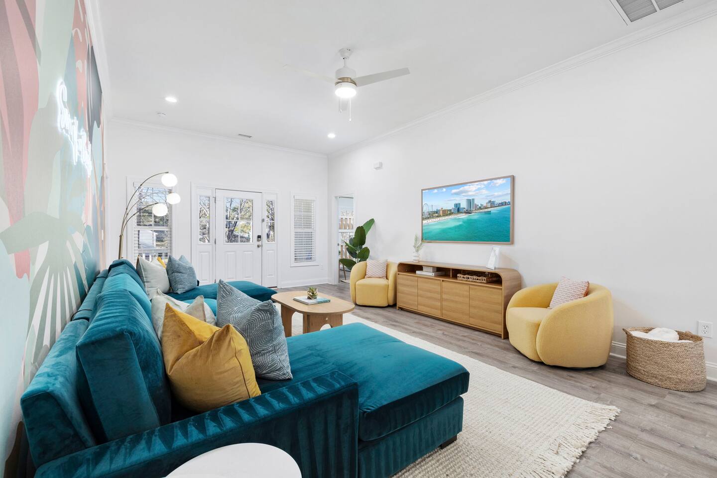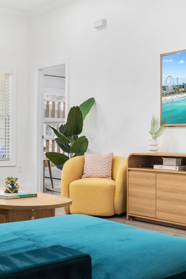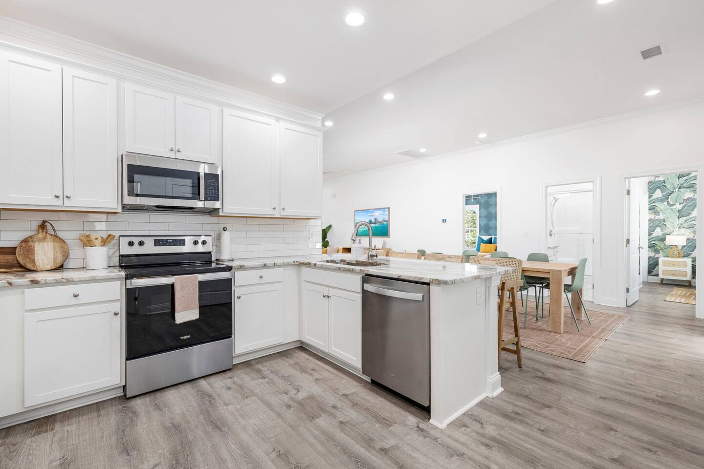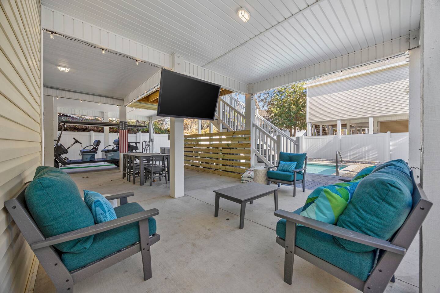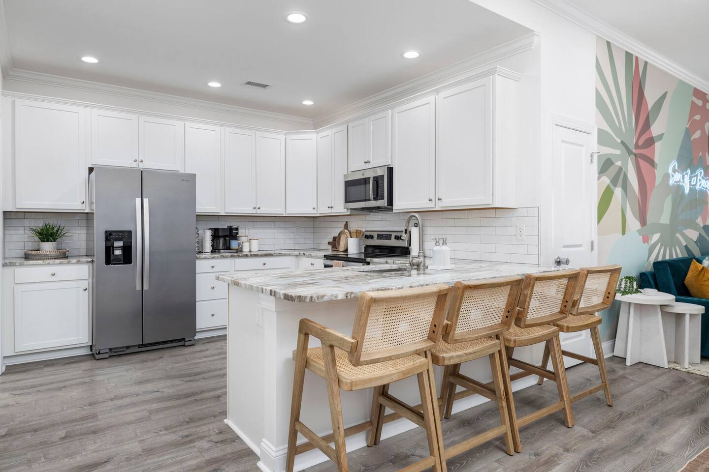 Inside, the home welcomes you with a bright and inviting living room, featuring a plush teal sectional sofa accented with colorful throw pillows and a playful mural that sets the tone for your stay. The open dining area includes a modern wooden dining table with seating for eight, complemented by chic leaf-inspired wall art. The fully equipped kitchen offers everything you need to prepare meals, whether you're whipping up breakfast before heading to the beach or enjoying a relaxed dinner at home. Each bedroom has been thoughtfully designed with its own personality: the master suite showcases soothing palm tree wallpaper and a serene color palette, while the second king room pops with rich teal walls and golden accents. The third king bedroom embraces a lush tropical vibe with banana leaf wallpaper and soft, earthy tones, and the bunk room is a whimsical retreat featuring vibrant seahorse-patterned wallpaper and two twin-over-twin bunk beds. Outside, the magic continues. Your private heated saltwater pool is surrounded by ample lounging space, perfect for soaking up the sun or enjoying a refreshing dip. The covered deck features comfortable seating for relaxing with morning coffee or evening cocktails, while the dining area under the house is ideal for al fresco meals. String lights add a cozy ambiance to both spaces, making evenings truly special. Lounge chairs and bright decorative pillows line the patio, creating the perfect spot for unwinding after a day of exploring. For added convenience, rent the on-site golf cart to zip to the beach or explore nearby Barefoot Landing, known for its shopping, dining, and entertainment options. With its unbeatable location, thoughtful amenities, and stylish decor, "Son of a Beach" is more than just a vacation home—it’s a destination. Book your stay today and experience the very best of North Myrtle Beach!