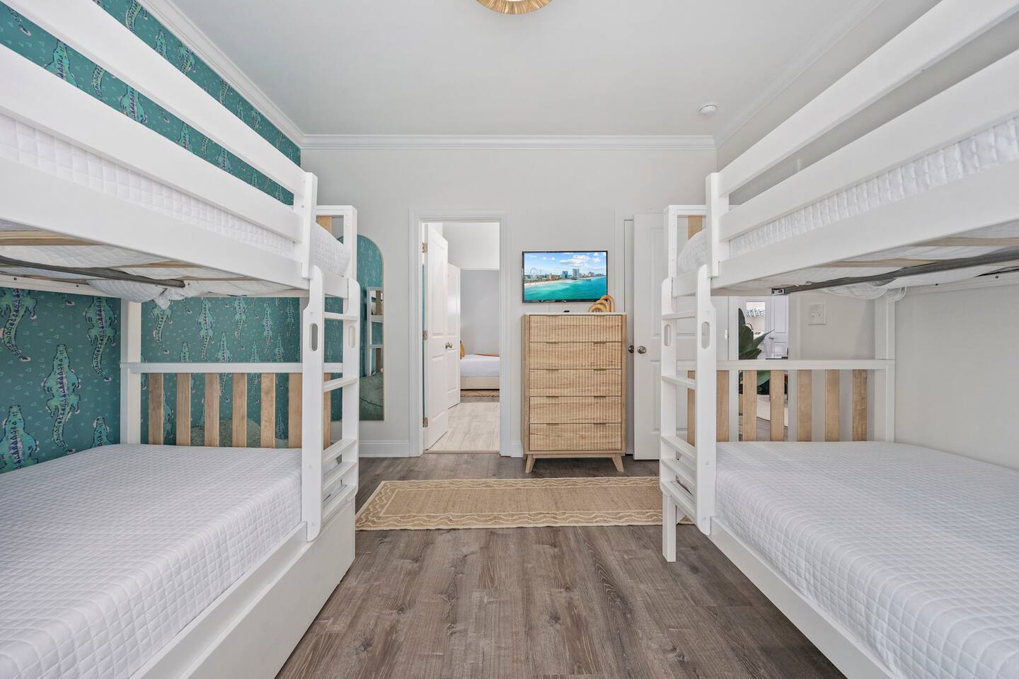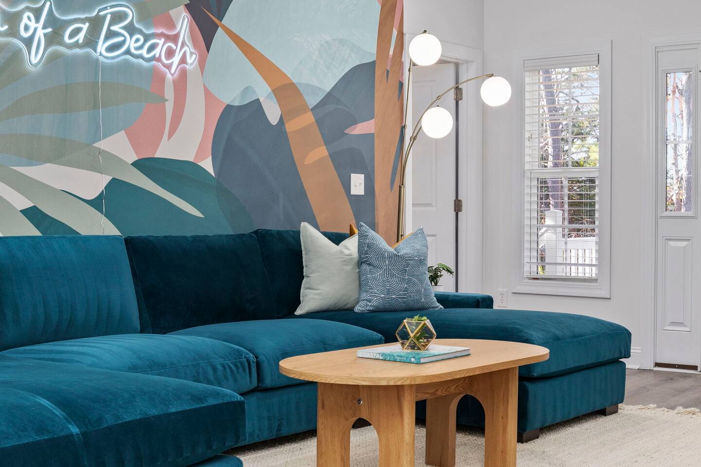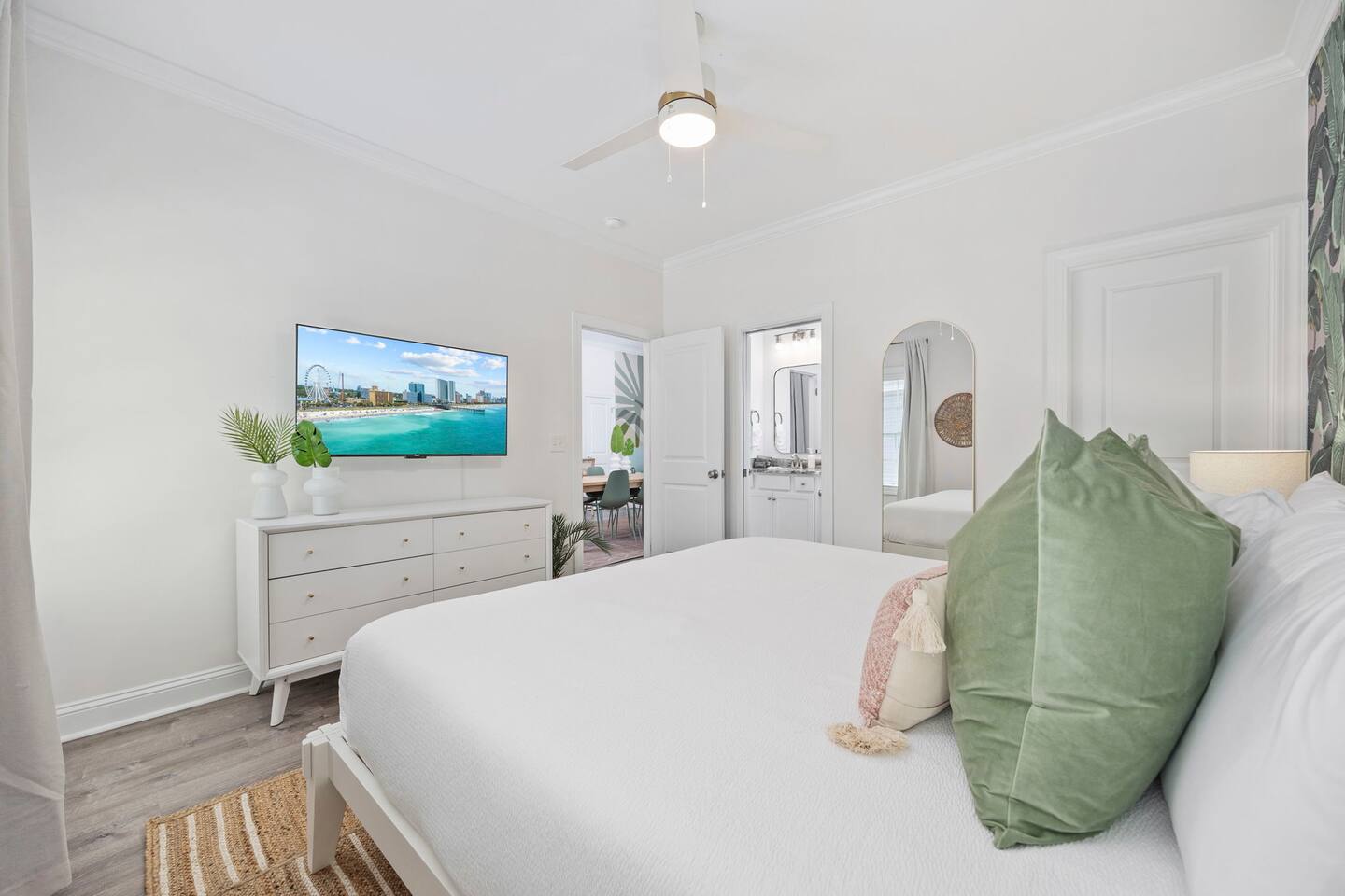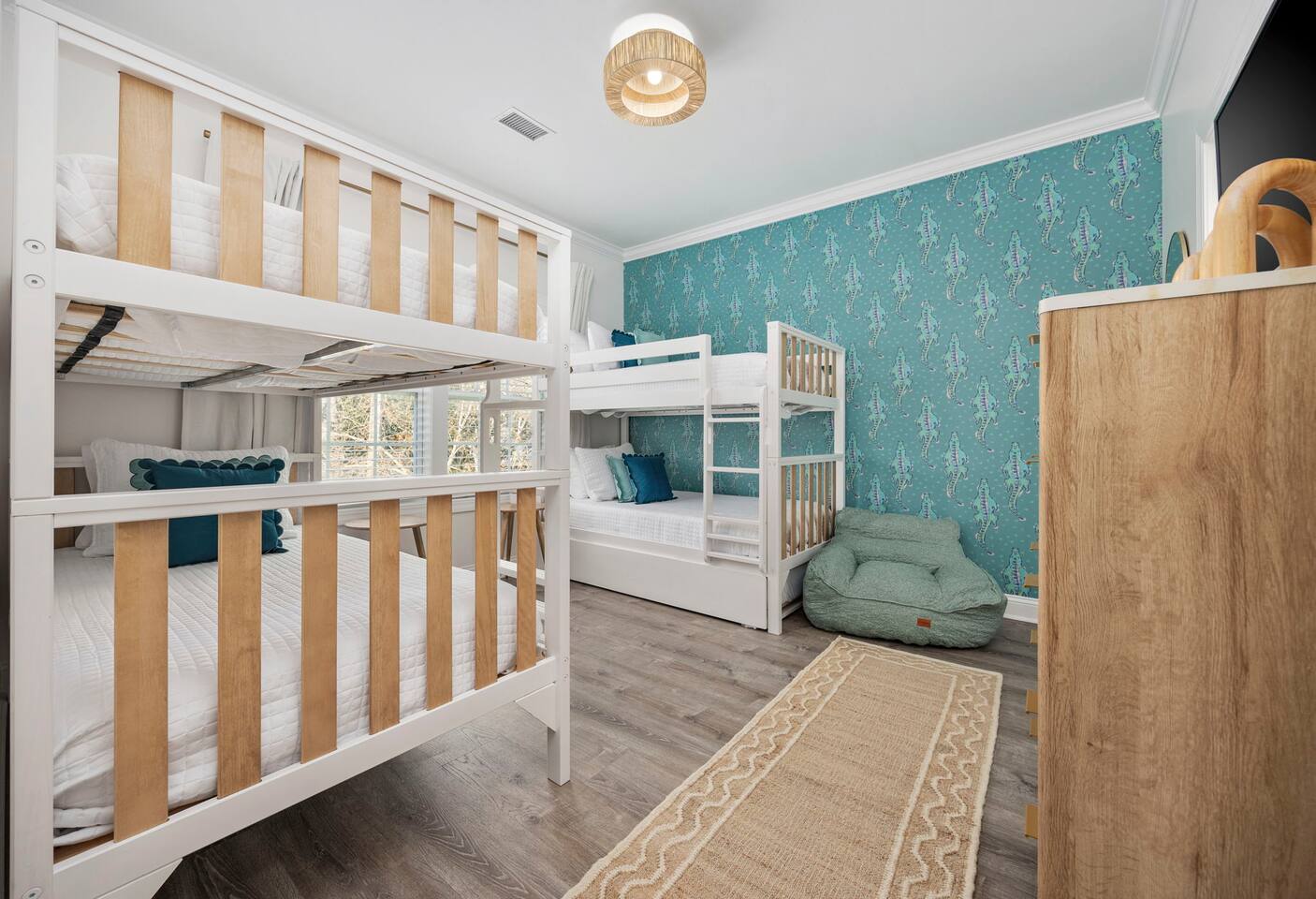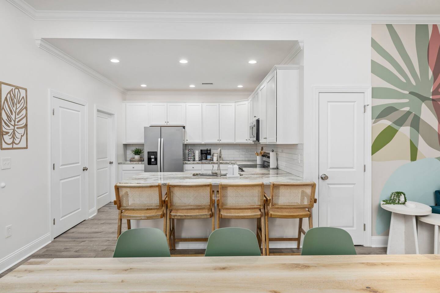 Inside, the home welcomes you with a bright and inviting living room, featuring a plush teal sectional sofa accented with colorful throw pillows and a playful mural that sets the tone for your stay. The open dining area includes a modern wooden dining table with seating for eight, complemented by chic leaf-inspired wall art. The fully equipped kitchen offers everything you need to prepare meals, whether you're whipping up breakfast before heading to the beach or enjoying a relaxed dinner at home. Each bedroom has been thoughtfully designed with its own personality: the master suite showcases soothing palm tree wallpaper and a serene color palette, while the second king room pops with rich teal walls and golden accents. The third king bedroom embraces a lush tropical vibe with banana leaf wallpaper and soft, earthy tones, and the bunk room is a whimsical retreat featuring vibrant seahorse-patterned wallpaper and two twin-over-twin bunk beds. Outside, the magic continues. Your private heated saltwater pool is surrounded by ample lounging space, perfect for soaking up the sun or enjoying a refreshing dip. The covered deck features comfortable seating for relaxing with morning coffee or evening cocktails, while the dining area under the house is ideal for al fresco meals. String lights add a cozy ambiance to both spaces, making evenings truly special. Lounge chairs and bright decorative pillows line the patio, creating the perfect spot for unwinding after a day of exploring. For added convenience, rent the on-site golf cart to zip to the beach or explore nearby Barefoot Landing, known for its shopping, dining, and entertainment options. With its unbeatable location, thoughtful amenities, and stylish decor, "Son of a Beach" is more than just a vacation home—it’s a destination. Book your stay today and experience the very best of North Myrtle Beach!