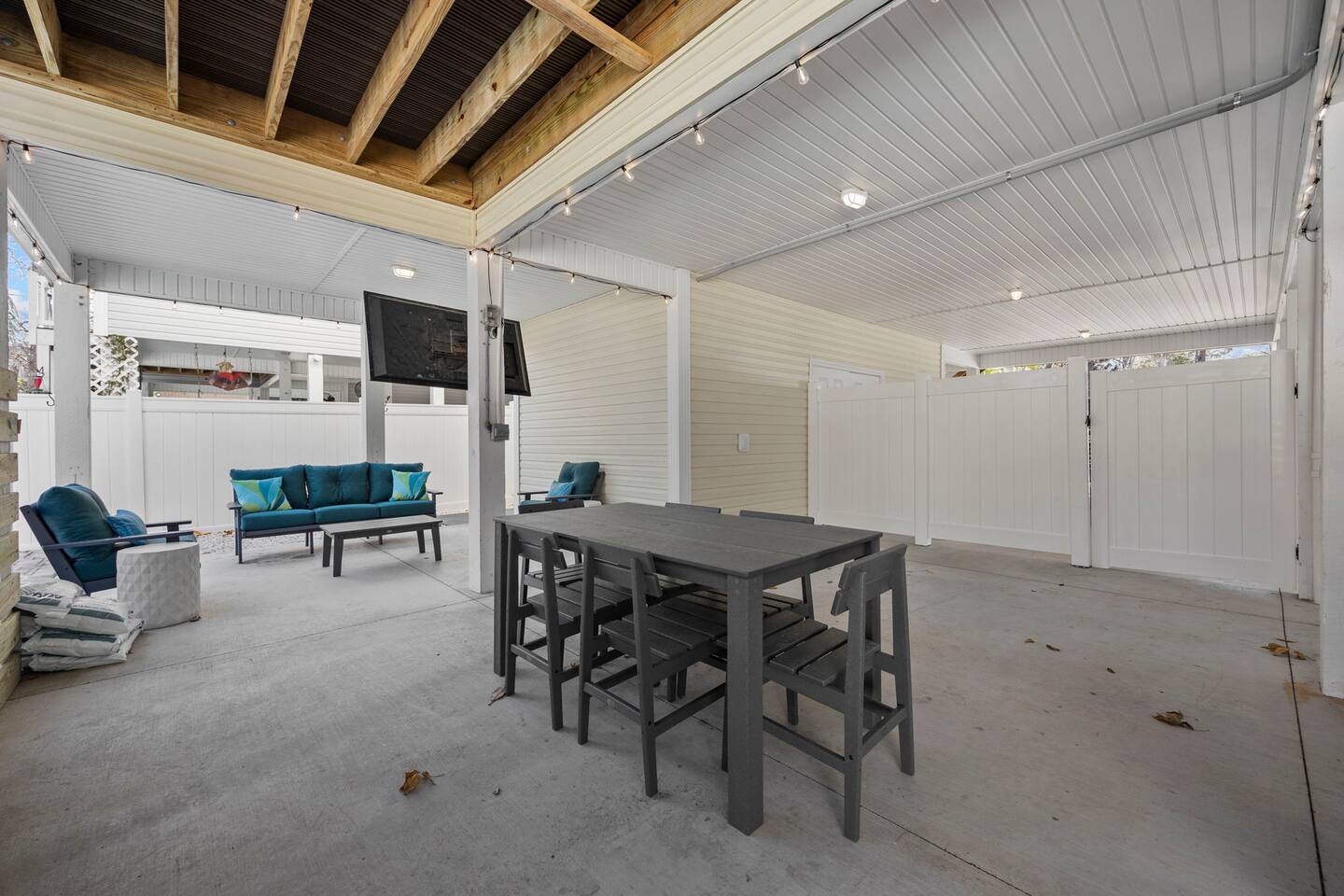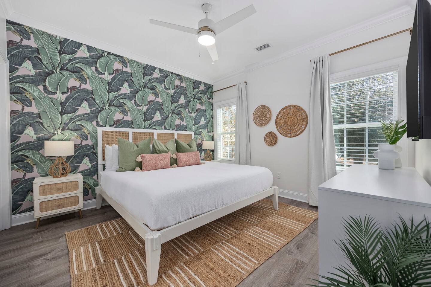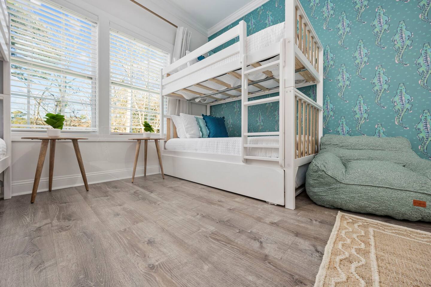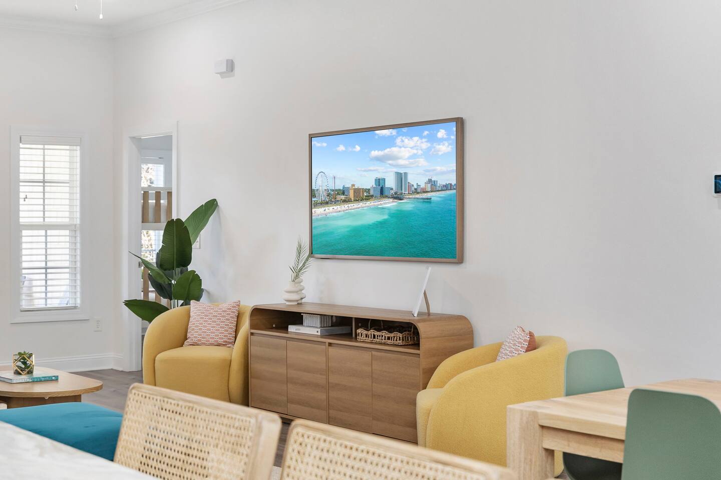 Inside, the home welcomes you with a bright and inviting living room, featuring a plush teal sectional sofa accented with colorful throw pillows and a playful mural that sets the tone for your stay. The open dining area includes a modern wooden dining table with seating for eight, complemented by chic leaf-inspired wall art. The fully equipped kitchen offers everything you need to prepare meals, whether you're whipping up breakfast before heading to the beach or enjoying a relaxed dinner at home. Each bedroom has been thoughtfully designed with its own personality: the master suite showcases soothing palm tree wallpaper and a serene color palette, while the second king room pops with rich teal walls and golden accents. The third king bedroom embraces a lush tropical vibe with banana leaf wallpaper and soft, earthy tones, and the bunk room is a whimsical retreat featuring vibrant seahorse-patterned wallpaper and two twin-over-twin bunk beds. Outside, the magic continues. Your private heated saltwater pool is surrounded by ample lounging space, perfect for soaking up the sun or enjoying a refreshing dip. The covered deck features comfortable seating for relaxing with morning coffee or evening cocktails, while the dining area under the house is ideal for al fresco meals. String lights add a cozy ambiance to both spaces, making evenings truly special. Lounge chairs and bright decorative pillows line the patio, creating the perfect spot for unwinding after a day of exploring. For added convenience, rent the on-site golf cart to zip to the beach or explore nearby Barefoot Landing, known for its shopping, dining, and entertainment options. With its unbeatable location, thoughtful amenities, and stylish decor, "Son of a Beach" is more than just a vacation home—it’s a destination. Book your stay today and experience the very best of North Myrtle Beach!