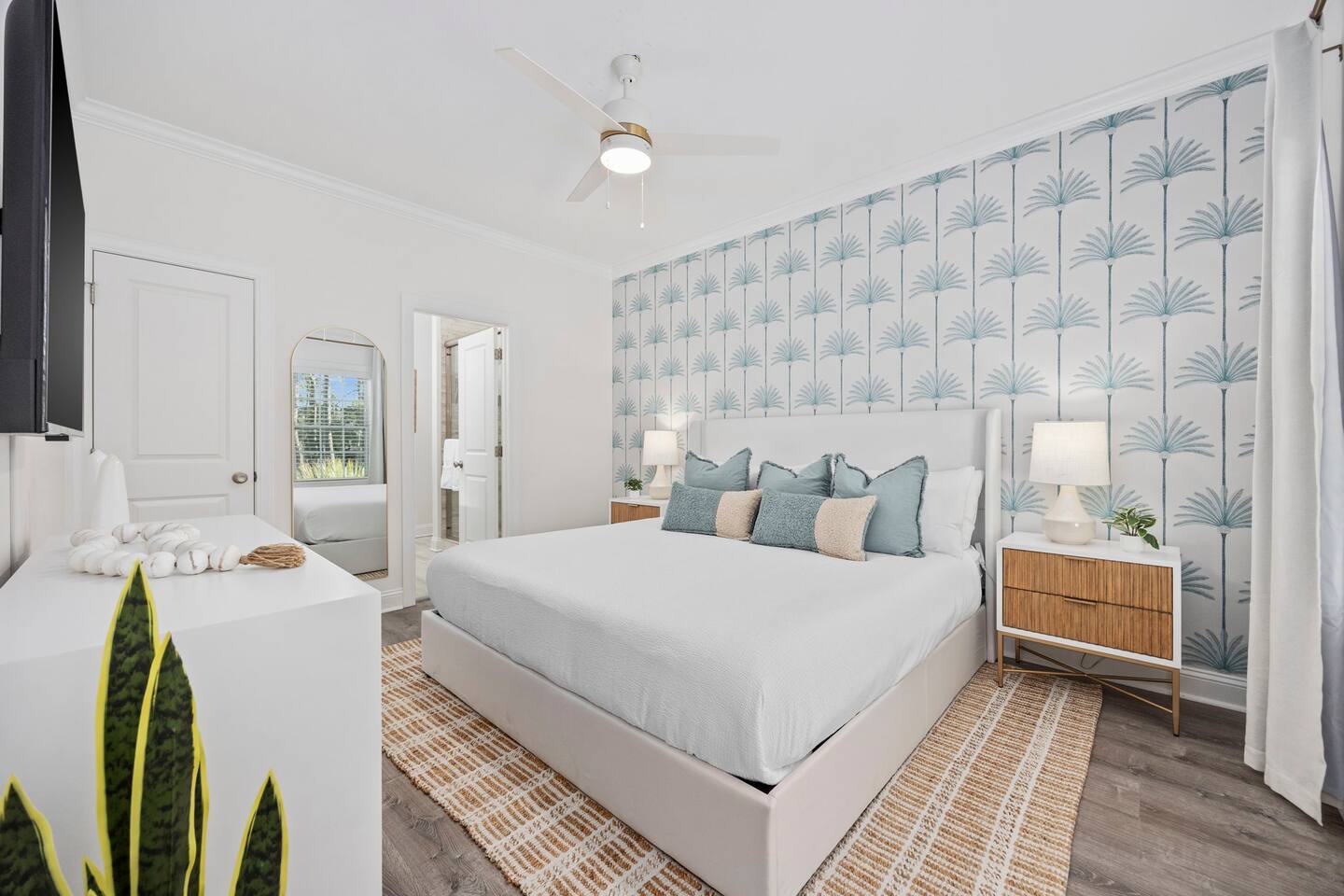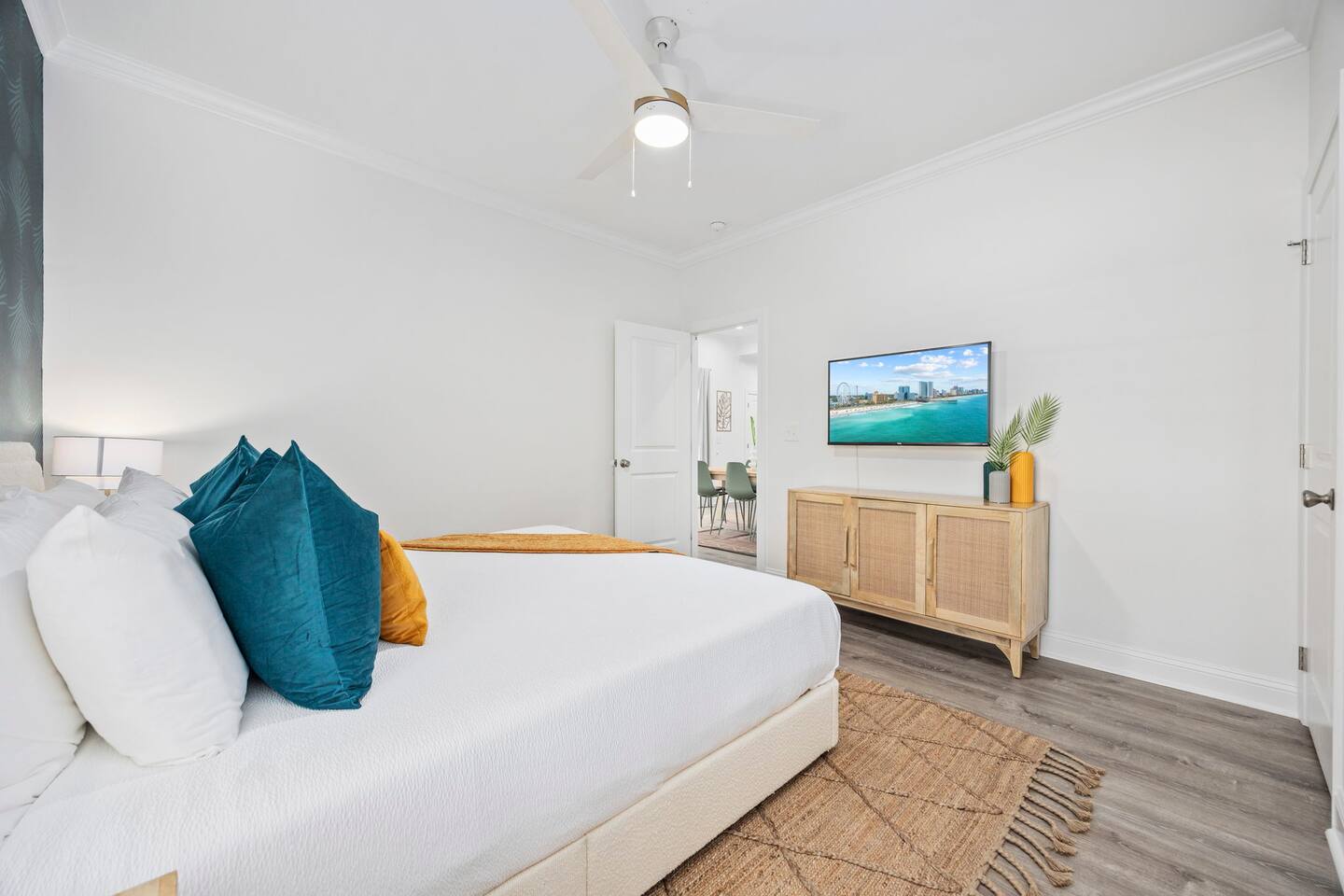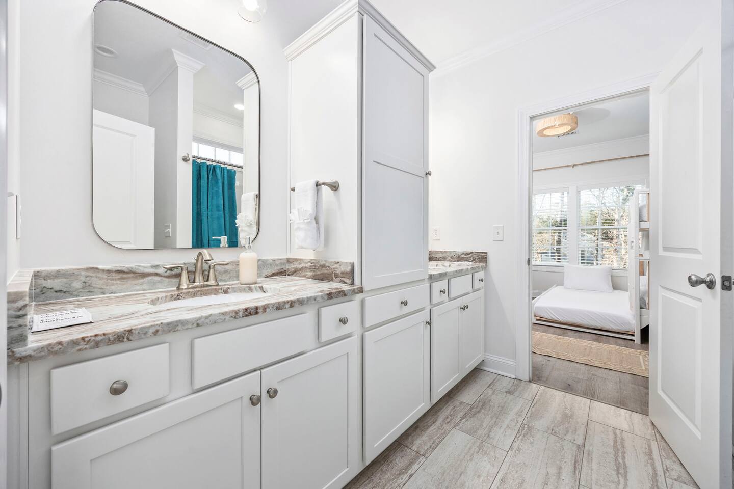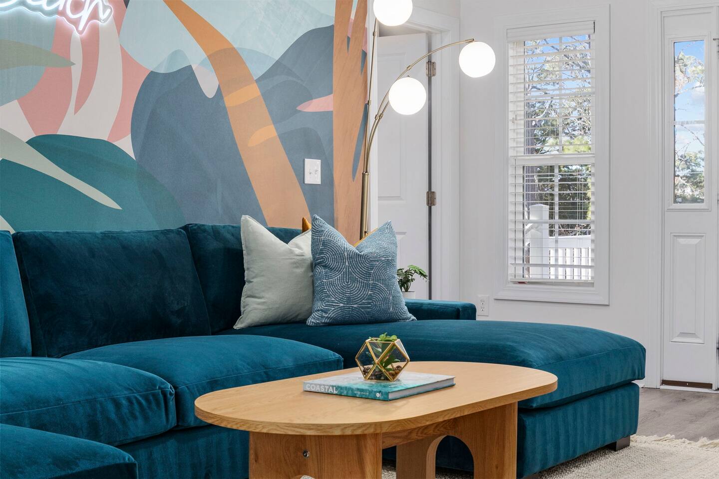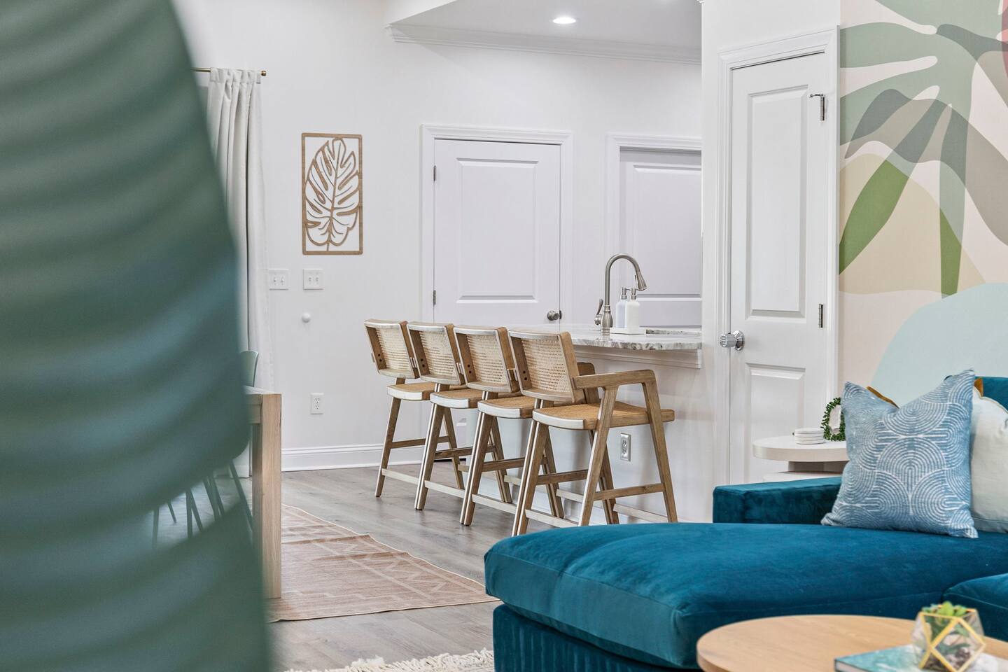 Inside, the home welcomes you with a bright and inviting living room, featuring a plush teal sectional sofa accented with colorful throw pillows and a playful mural that sets the tone for your stay. The open dining area includes a modern wooden dining table with seating for eight, complemented by chic leaf-inspired wall art. The fully equipped kitchen offers everything you need to prepare meals, whether you're whipping up breakfast before heading to the beach or enjoying a relaxed dinner at home. Each bedroom has been thoughtfully designed with its own personality: the master suite showcases soothing palm tree wallpaper and a serene color palette, while the second king room pops with rich teal walls and golden accents. The third king bedroom embraces a lush tropical vibe with banana leaf wallpaper and soft, earthy tones, and the bunk room is a whimsical retreat featuring vibrant seahorse-patterned wallpaper and two twin-over-twin bunk beds. Outside, the magic continues. Your private heated saltwater pool is surrounded by ample lounging space, perfect for soaking up the sun or enjoying a refreshing dip. The covered deck features comfortable seating for relaxing with morning coffee or evening cocktails, while the dining area under the house is ideal for al fresco meals. String lights add a cozy ambiance to both spaces, making evenings truly special. Lounge chairs and bright decorative pillows line the patio, creating the perfect spot for unwinding after a day of exploring. For added convenience, rent the on-site golf cart to zip to the beach or explore nearby Barefoot Landing, known for its shopping, dining, and entertainment options. With its unbeatable location, thoughtful amenities, and stylish decor, "Son of a Beach" is more than just a vacation home—it’s a destination. Book your stay today and experience the very best of North Myrtle Beach!