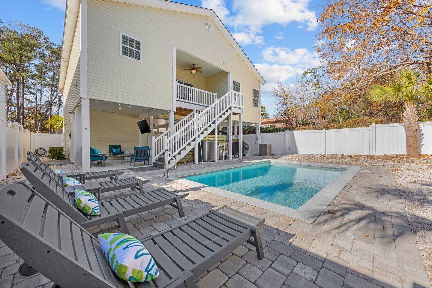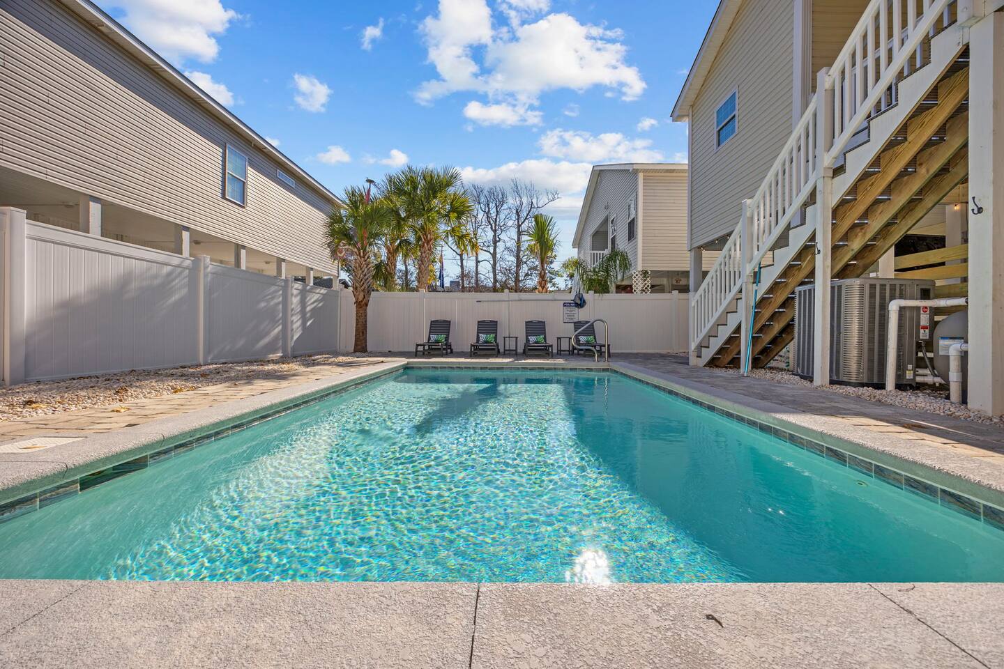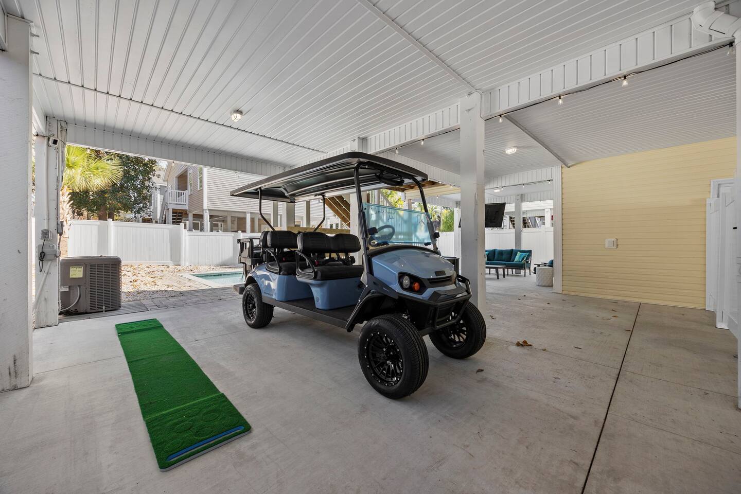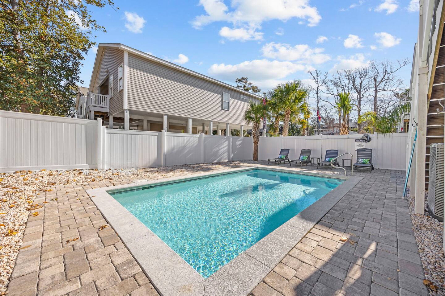 Please inquire about renting our on-site golf cart! The pool is heated using a heat pump. Gas heating is not an option in North Myrtle Beach due to the lack of natural gas service and city restrictions on buried propane tanks. Pool heating is weather dependent, and during cooler weather or cold nights, the pool may not maintain warm temperatures. As a general rule of thumb, outdoor temperatures typically need to stay in the 50s, including overnight, for the heat pump to effectively generate and maintain heat. In most years, the pool can be heated from late February or early March through mid-October, and sometimes longer if weather conditions cooperate.