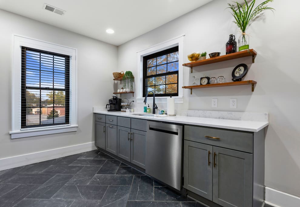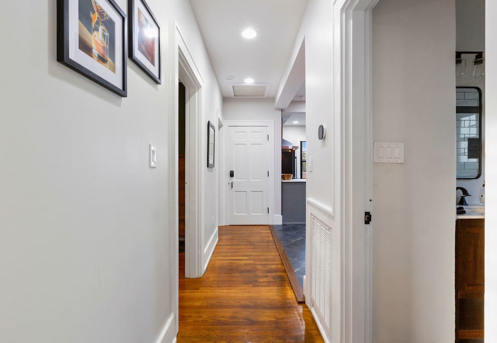 Welcome to Oak, the upper unit of The Copper & Oak — a thoughtfully restored 1909 home located in the heart of Shelbyville on the Bourbon Trail. Blending historic charm with modern style, this spacious two-bedroom, two-bath retreat offers the perfect balance of comfort and character. Step into the bright, open living area featuring rich blue walls, warm wood floors, and an inviting mix of classic and modern décor. Kick back with a cocktail or local soda after a day of exploring distilleries, or gather for a movie night on the plush leather seating. The fully equipped kitchen is sleek and functional, ready for everything from morning coffee to full dinners around the chic dining table. Both bedrooms are thoughtfully designed with king beds, premium linens, and warm lighting for the ultimate in relaxation. The bathrooms blend vintage charm with modern luxury — walk-in tile showers, stylish vanities, and thoughtful details throughout. From your doorstep, stroll through downtown Shelbyville’s boutiques, coffee shops, and restaurants — everything you need for a true local experience is within walking distance. Whether you’re here for the Bourbon Trail, horse country adventures, or simply a weekend of rest and good company, the upper unit of The Copper & Oak offers timeless comfort with a modern twist. *** Please Note *** - The hot tub is available only for guests staying in the lower unit, Copper, or when both units are reserved together under the combined listing, The Copper & Oak.